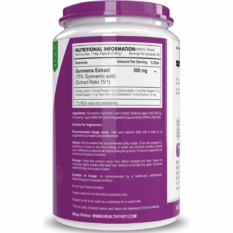 | Ingredients: Gymnema Sylvestre Leaf Extract, Bulking Agent INS 460 (i), Anticaking Agent INS 341(iii) & Vegetable Capsule Shell (HPMC) (INS 464). | ||