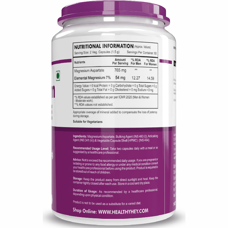 | Ingredients: Magnesium Aspartate, Bulking Agent (INS 460 (i)), Anticaking Agent (INS 551) & Vegetable Capsule Shell (HPMC) (INS 464) | |||