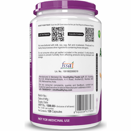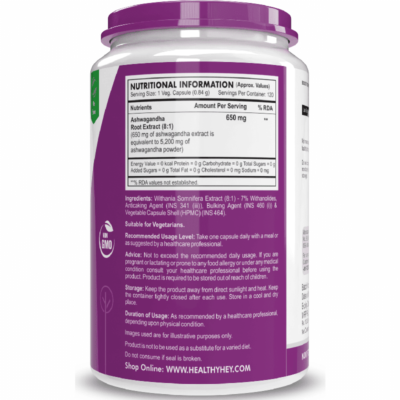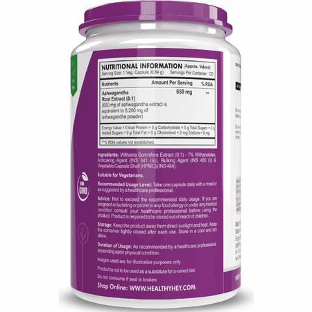 | Ingredients: Withania Somnifera Extract(8:1) - 7% Withanolides, Bulking Agent INS 460 (i), Anticaking Agent INS 551 & Vegetable Capsule Shell (HPMC) (INS 464) | |||