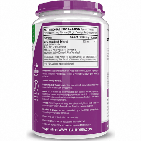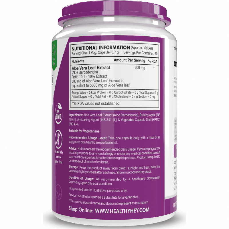 | Ingredients: Aloe Vera Leaf Extract(Aloe Barbadensis), Bulking Agent INS 460 (i), Anticaking Agent (INS 341 (iii)) & Vegetable Capsule Shell (HPMC) (INS 464) | ||