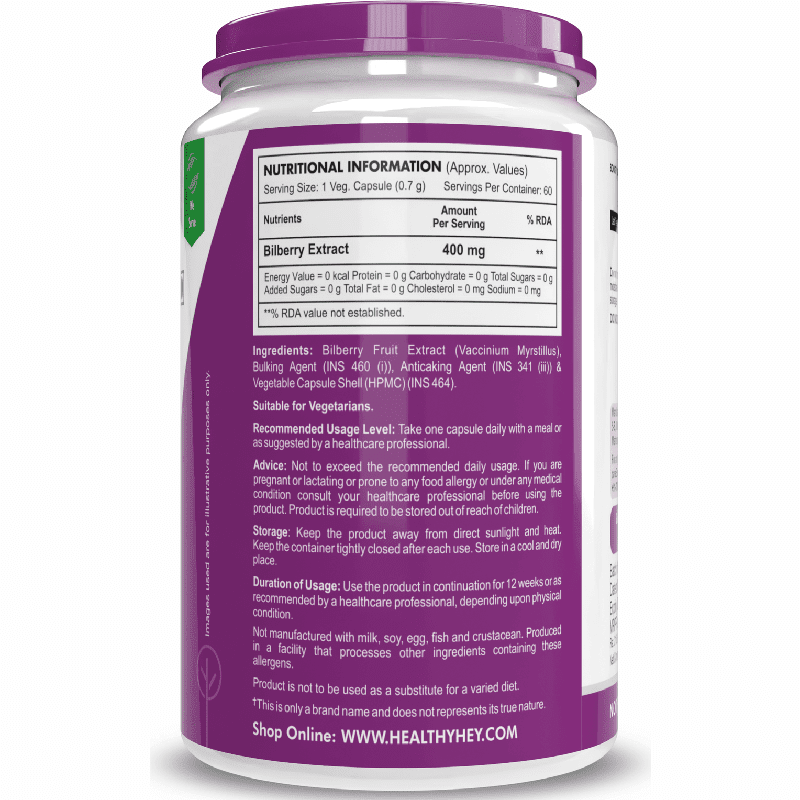| Ingredients: Bilberry Fruit Extract (Vaccinium myrtillus), Bulking Agent INS 460 (i), Anticaking Agent (INS 551) & Vegetable Capsule Shell (HPMC) (INS 464) | ||