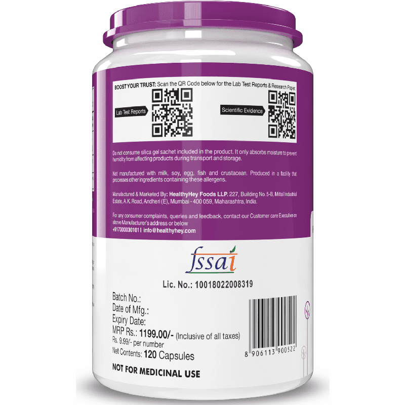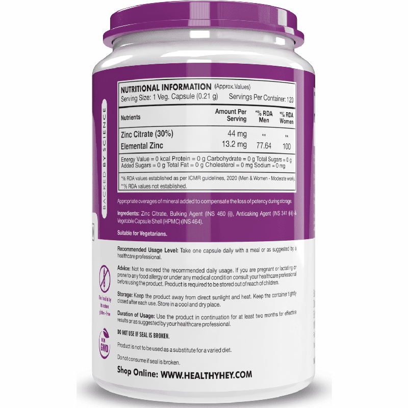 | Ingredients: Zinc Citrate, Bulking Agent (INS 460 (i)), Anticaking Agent (INS 341(iii)) & Vegetable Capsule Shell (HPMC) (INS 464) | |||