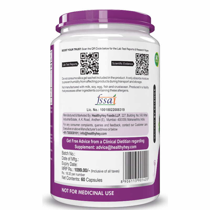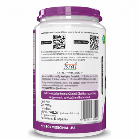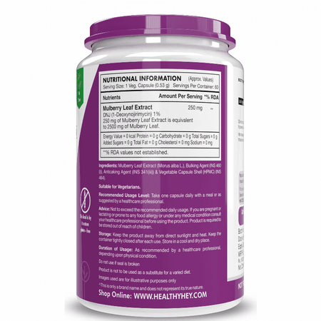 | Ingredients: Mulberry Leaf Extract, Bulking Agent INS 460 (i), Anticaking Agent INS 551 & Vegetable Capsule Shell (HPMC) (INS 464) | |||
