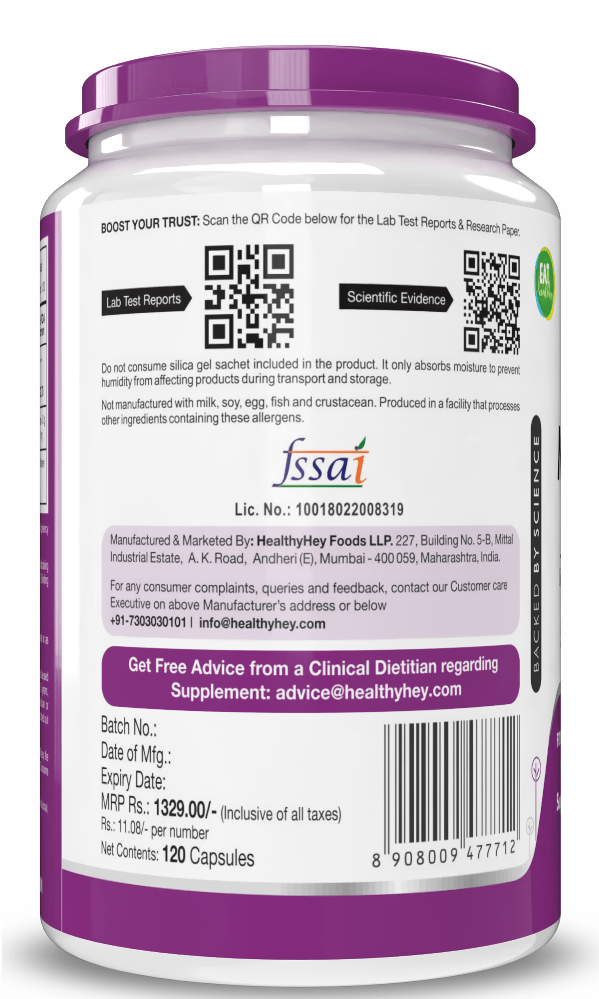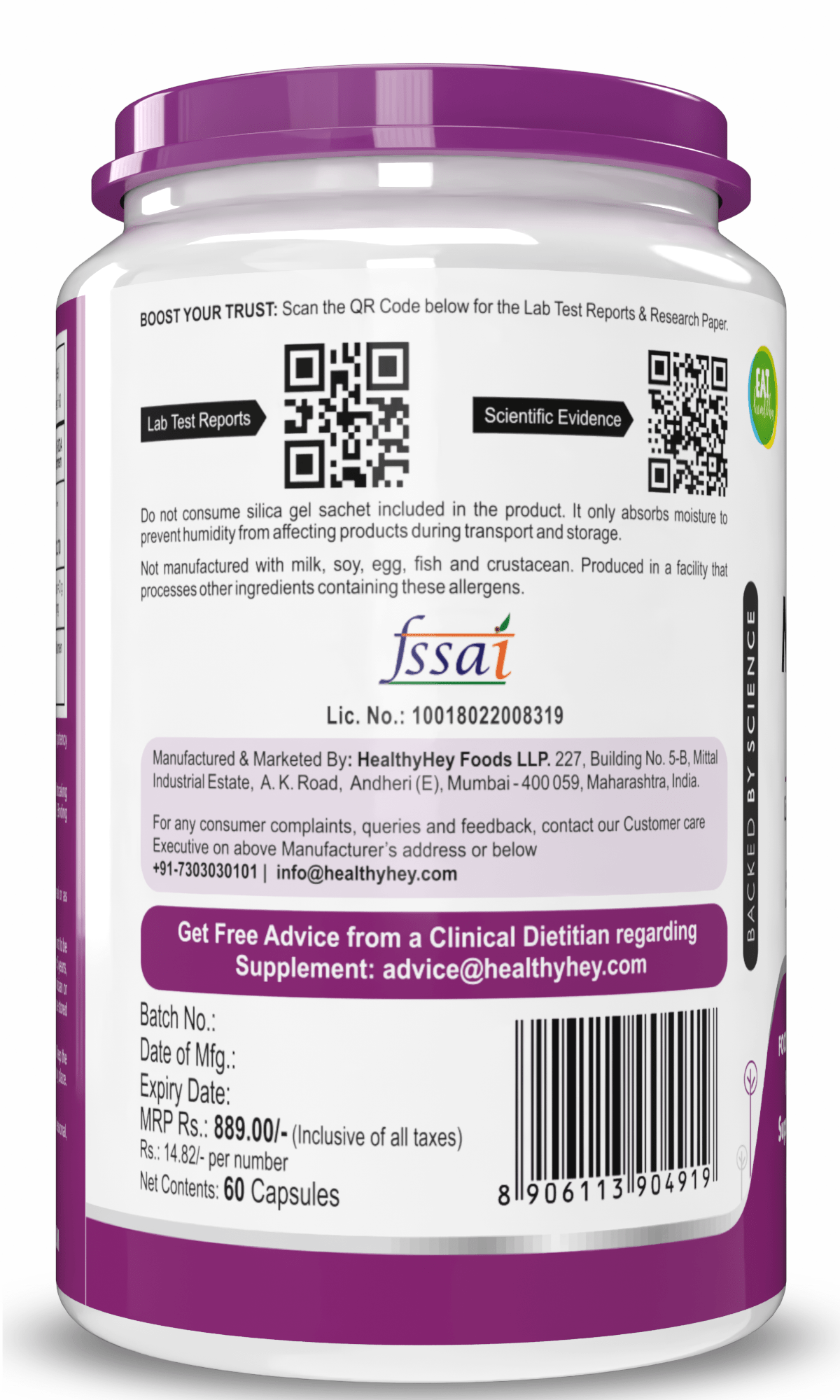 | Ingredients: Magnesium Glycinate, Bulking Agent INS 460 (i), Anticaking Agent (INS 341(iii)) & Vegetable Capsule Shell (HPMC) (INS 464) | |||