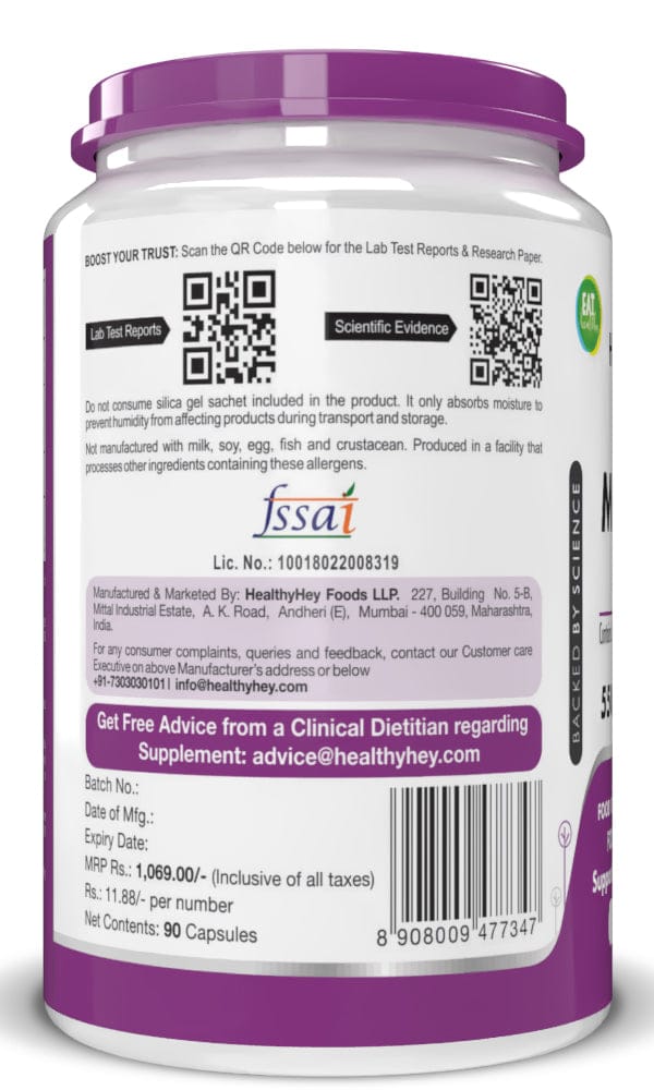 HealthyHey's Magnesium Glycinate is tested for heavy metals by an external NABL accredited laboratory. The FSSAI limit for lead in nutraceutical products is 2.5 mg/kg. Our results show lead levels well below this limit, indicating that the product is safe for consumption and free from any associated side effects. -