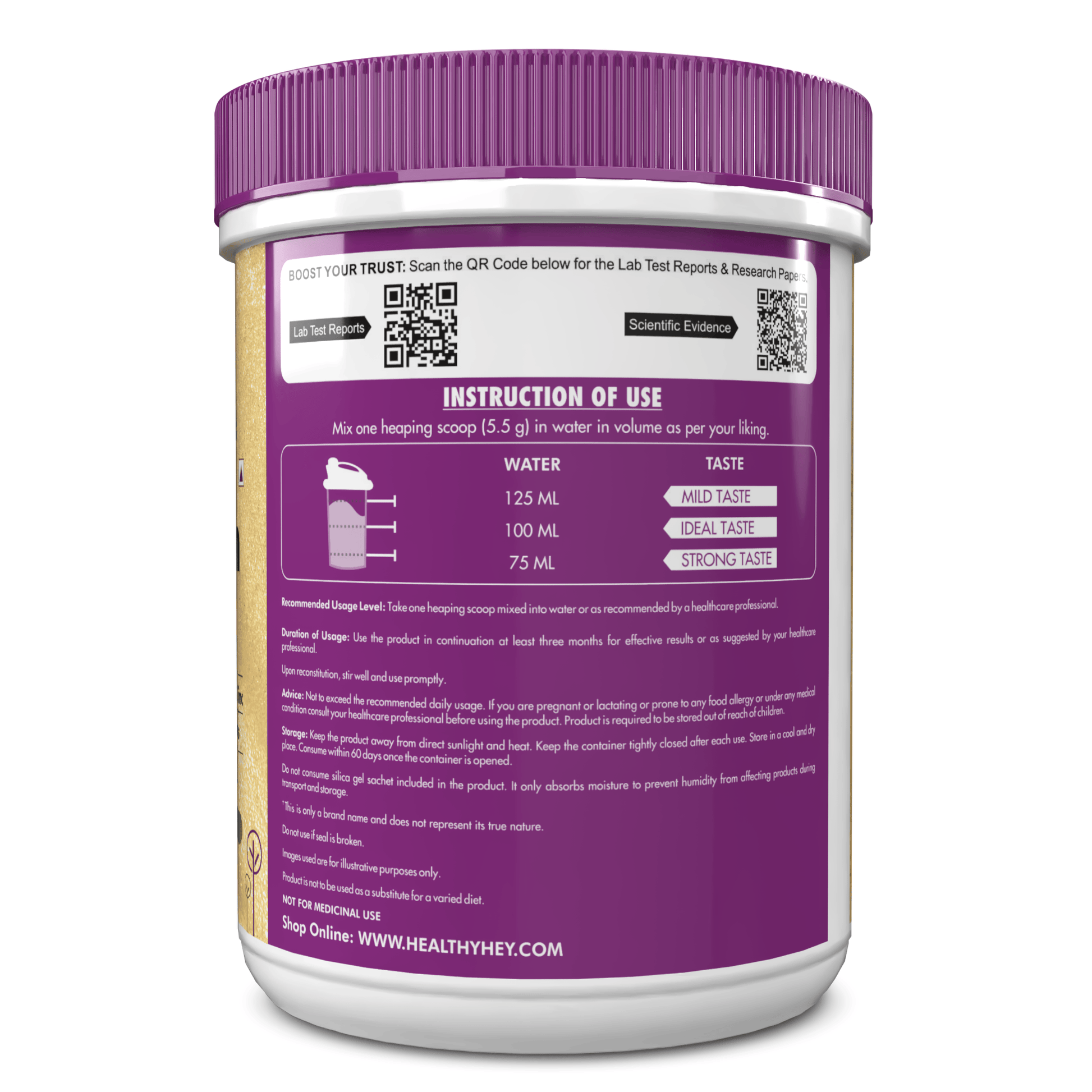 We recommend consuming our Glow-n-Shine Collagen Powder in two servings per day- one as your first drink of the day (preferably before breakfast) and the other as your last drink of the day (30–45 minutes after dinner) to help achieve faster and more noticeable results. For optimal effectiveness, we suggest using the product consistently for at least 3 months. Additionally, for personalized guidance based on your health goals, please refer to the 'Dosage Recommendations' section of the product on the official HealthyHey website.