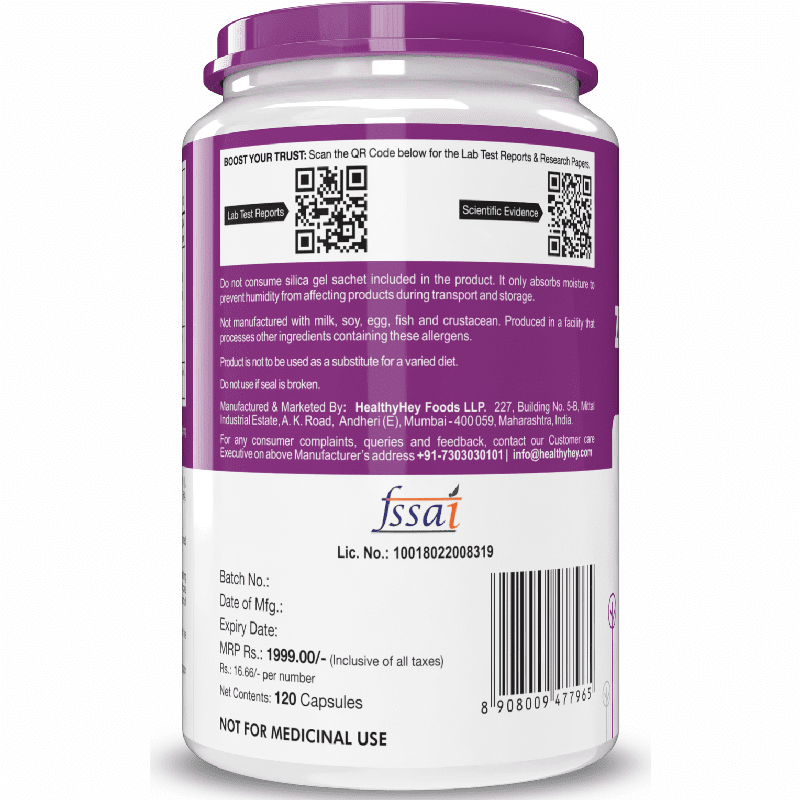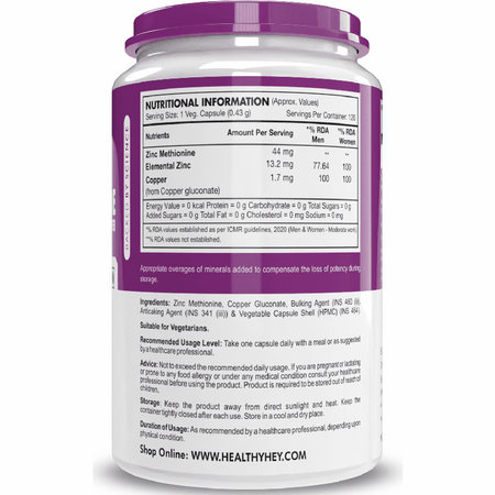 Ingredients: Zinc Methionine, Copper gluconate, Bulking agent (INS 460 (i)), Anticaking agent (INS 341(iii)) & Vegetable capsule shell (HPMC) (INS 464).