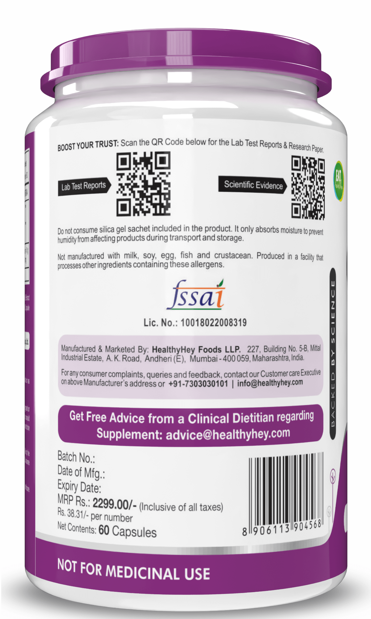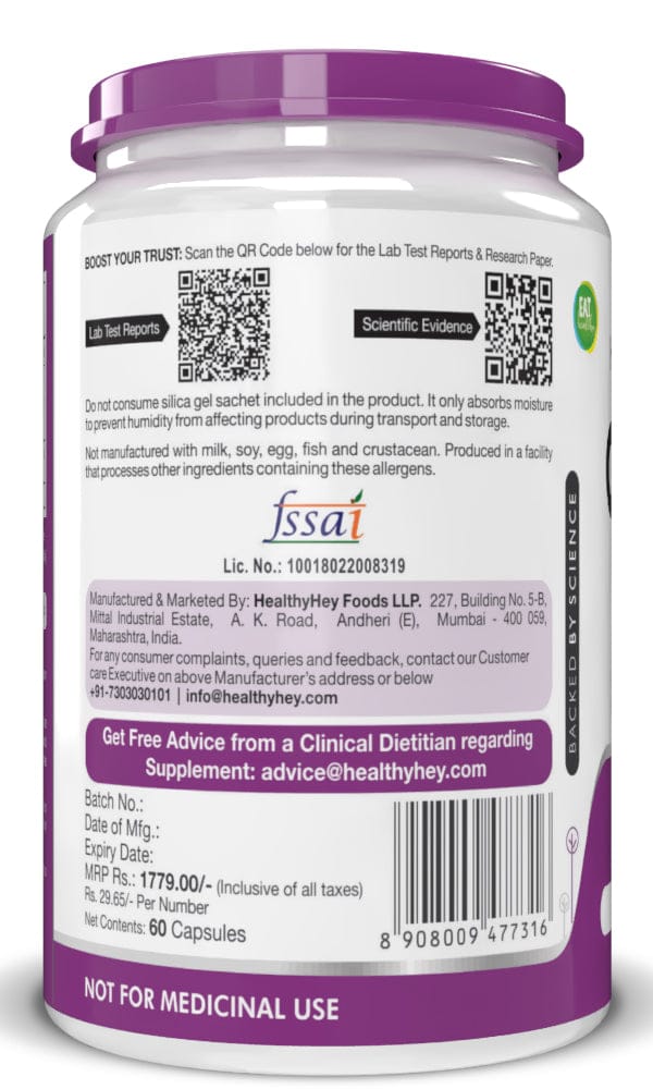 | Ingredients: CoQ10, Piper Nigrum Fruit Extract(Piperine)-BioPerine, Bulking Agent INS 460 (i), Anticaking Agent INS 341(iii) & Vegetable Capsule Shell (HPMC) (INS 464). | ||