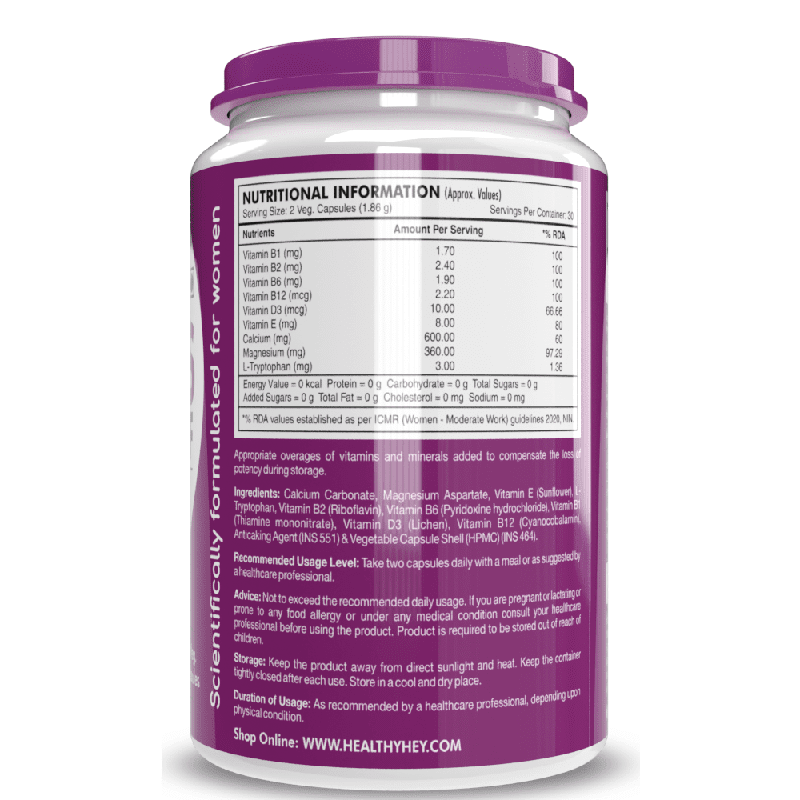 Ingredients: Calcium Carbonate, Magnesium Aspartate, Vitamin E (Sunflower), L-Tryptophan, Vitamin B2 (Riboflavin), Vitamin B6 (pyridoxine hydrochloride), Vitamin B1 (Thiamine mononitrate), Vitamin D3 (lichen), Vitamin B12 (Cyanocobalamin), Anticaking Agent (INS 551), and Vegetable Capsule Shell (HPMC) (INS 464).